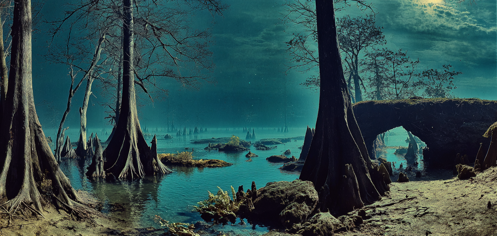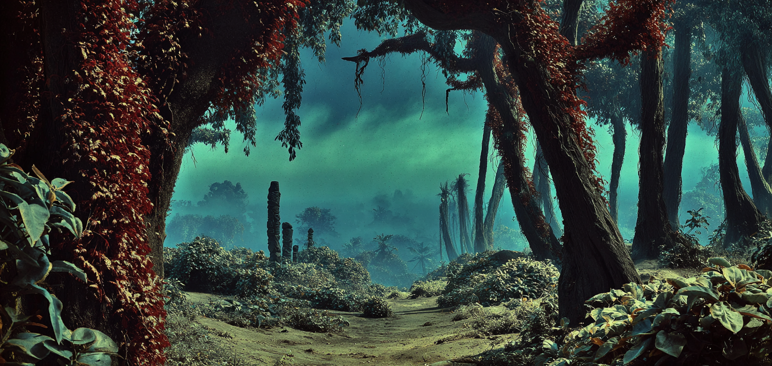 Au sud, une jungle oppressante déploie son labyrinthe végétal. Les troncs massifs tordent leurs racines comme des serpents, étouffant les ruines et les corps oubliés. Les lianes dégoulinent d’une sève rougeâtre, semblable à du sang coagulé. On dit que certaines plantes murmurent des promesses à ceux qui s’égarent trop longtemps.