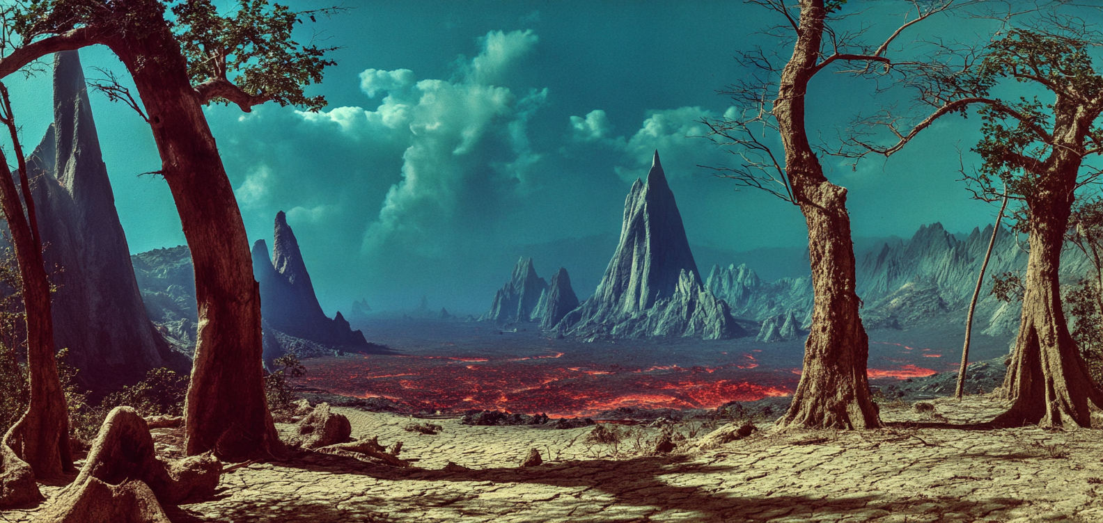 À l’est de l’île s’étendent les Plaines Cendrées, un désert lugubre de cendres et de roche volcanique, vestige de colères anciennes. Le sol y est brûlant, craquelé comme une peau calcinée, tandis que des geysers de fumée toxique jaillissent sans prévenir. Des ruines de temples de basalte noir émergent parfois des cendres, témoignages silencieux d’une civilisation disparue.